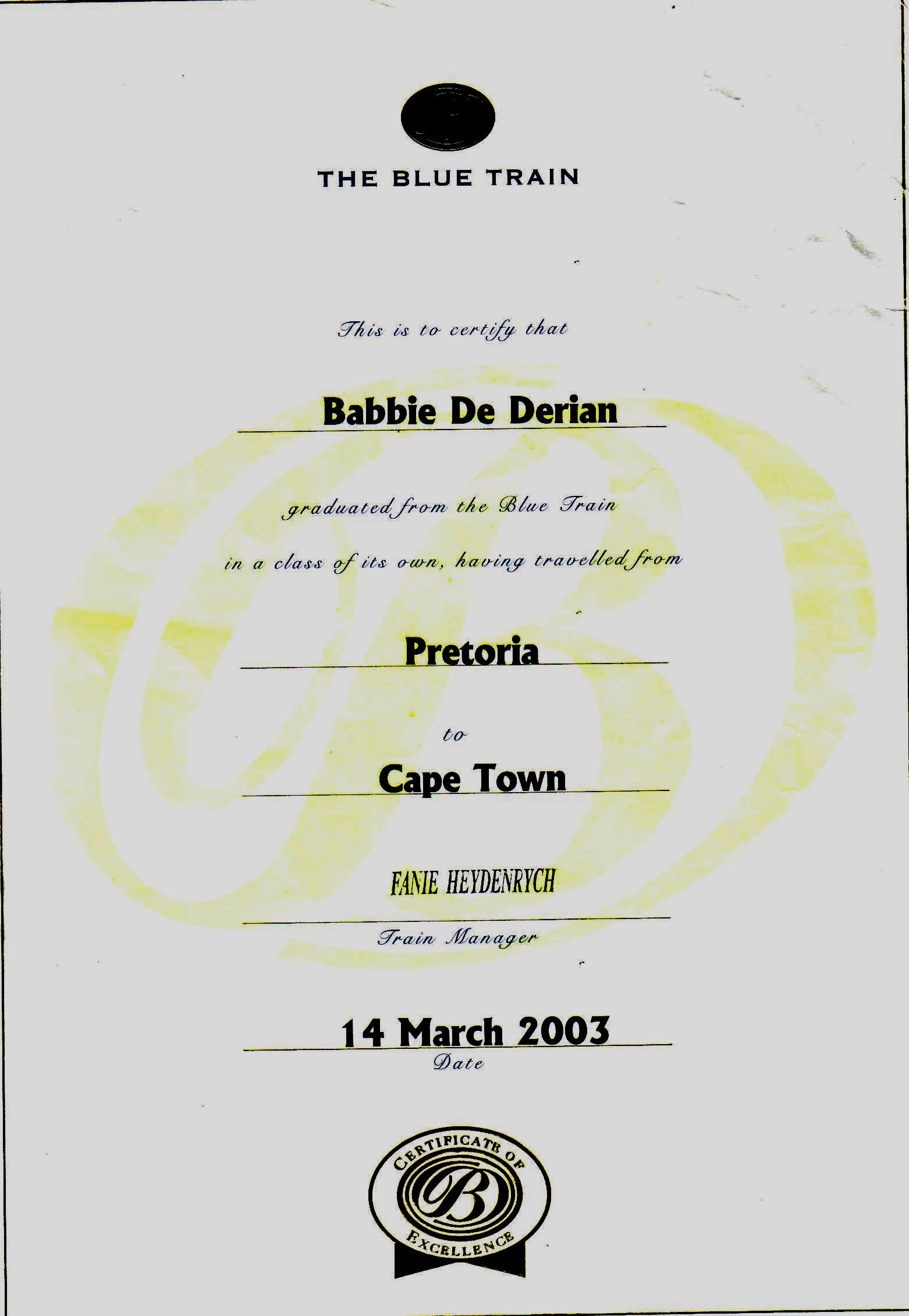 Modern and beautifully appointed with Old World charm, the Blue Train reminds me of a traveling lodge. At journey’s end, I am given a personalized citation: “certifying graduation from the Blue Train in a class of its own, having traveled from Pretoria to Cape Town”.