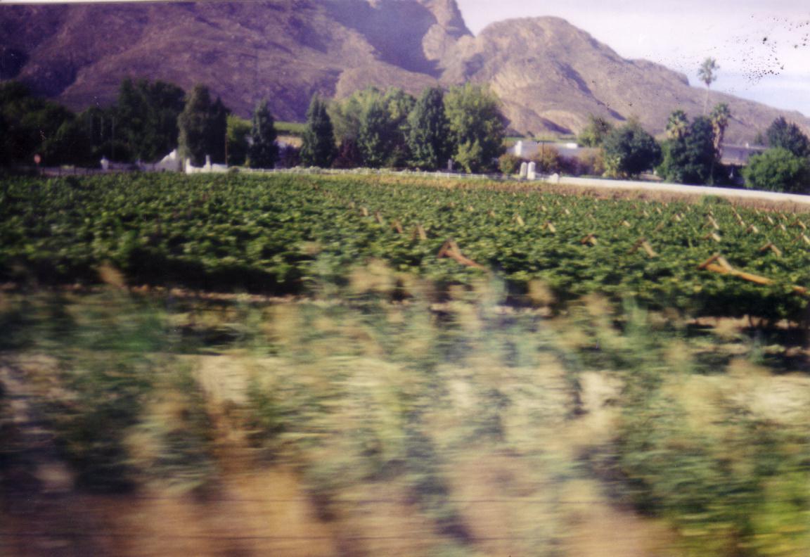 In the morning we pass lush vineyards, sun blushed valleys, a gold mine where gold dust rises like a mountain, and a pond of pink flamingos. We cross-mountains through dark tunnels, and wave at children in local townships; fields of mature sunflowers bend in the breeze.