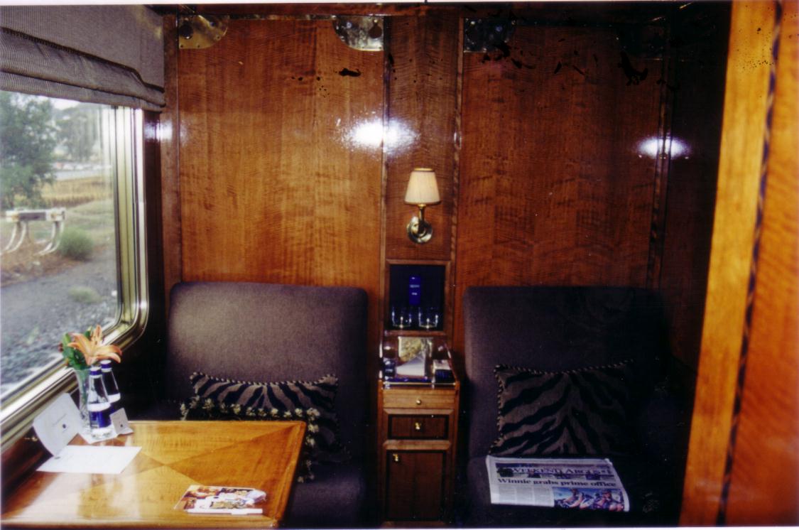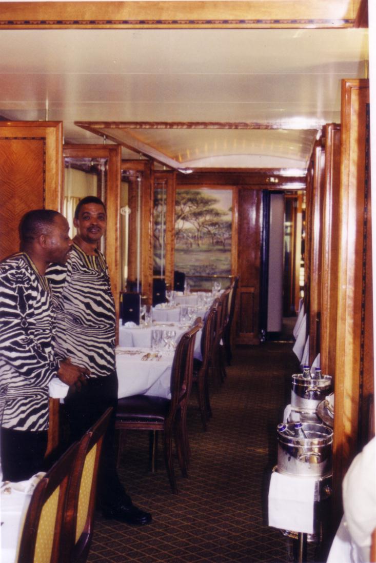 We drive to the Pretoria Train Station. Baggage handlers in zebra stripe shirts greet us; then tag and pile our luggage on highly polished brass carts. At the concierge desk, I am assigned compartment 28. The train accommodates fifty-four passengers.