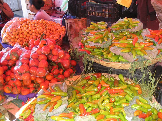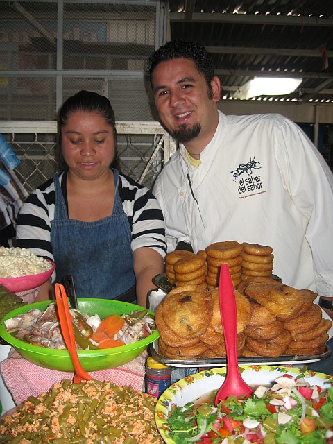 It is a treat to begin the day following him through the Central Mercado, where he and all the other chefs in town shop at 7 A.M. I am overwhelmed by the sights, smells and tastes I am introduced to, and the hot and spicy flavors that explode in my mouth. Manuel knows all the people who are busy cooking and grilling at their open stalls, and takes time to chat as he buys small and large chilies, tomatoes, small pumpkins ( Mexican zucchinis), red and green mole powders and spices ( for the mole we will prepare), chopped fried grasshoppers, and both string and bulk Oaxaca cow cheese.