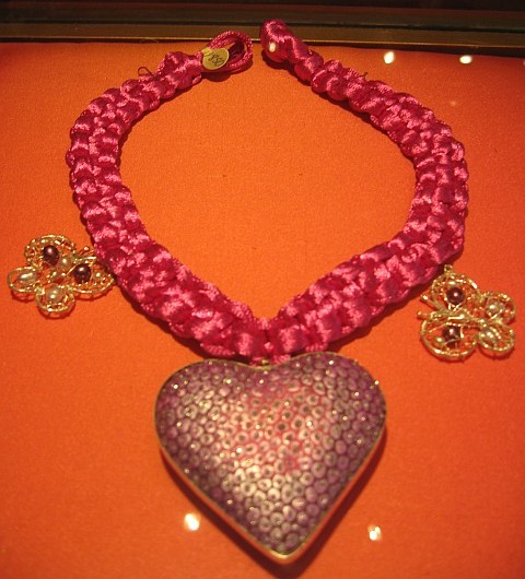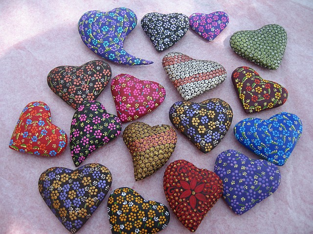 Experimenting with different techniques, she took a design from a typical dress and hand painted it onto a bracelet. In her new and 4th collection, she mixes leather and hand carved woods with her favorite flowers, animals and hearts.