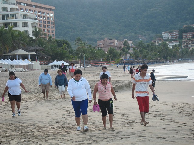 It is easy to reach the beach from my third floor room; I simply walk down a ramp which leads directly onto the sand. I watch a bird duck under the waves before they break, then reappear on the calm water. I follow his pattern; diving under a wave; the sea welcomes me. I wander down the beach; a fisherman from Zihuatanejo casts his line into the sea. He wears a diamond amulet at the end of a beaded rope, and tells me “there are more fish (which he sells) off this beach.” He has three fish in his bucket; I call him guapo and promise to come back to photo him in the morning. Two massage tents are set up at the edge of the sand. As I pass, two masseuses run down to entice me into paying $25 for an hour massage and $16 for a half hour. Quite high, considering a massage on the beach in Phuket, Thailand, only costs $5.