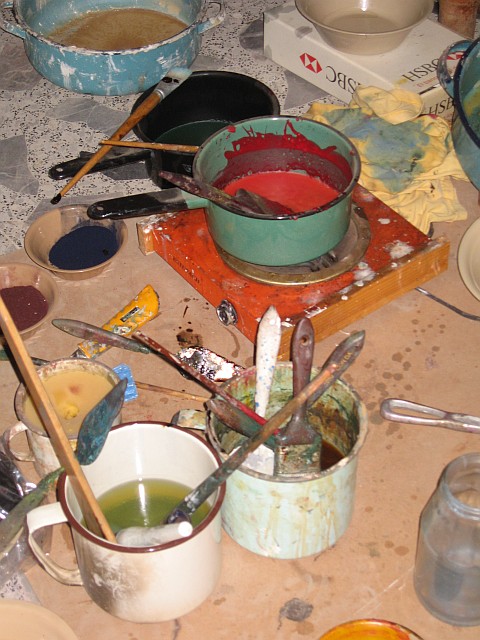 In his studio, which he calls his kitchen of mixed media, he demonstrates and discusses his techniques which combine inks and resins to create texture and depth. He is always looking for new textures that give him an opportunity to challenge his creativity. Pantaleon is very critical of his work. “I throw away many paintings; I have to like it before I sell it. My work is dangerous, mixing varnishes and lots of chemicals with natural pigments.”