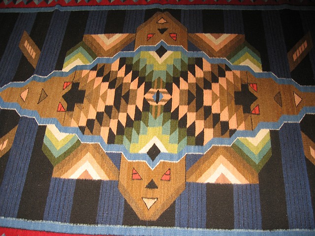 Pantaleon Ruiz is proud of his ancestral Zapotec origins and the weaving traditions passed down from his grandfather to his father and on to him. After living in San Francisco for a number of years and traveling the world, he returned to his village eight years ago to confront and master his painting, and to begin weaving. His canvases are huge; his work vibrant and intense. Pots of paint and a mix of different size brushes lie on a sheet by a painting he has yet to complete. Geometric figures and abstract designs express the calm of his sacred heritage. Influenced by the time he spent living and working abroad, he approaches art with an International vision, exploring all of his resources with a vivid passion and unbridled imagination.